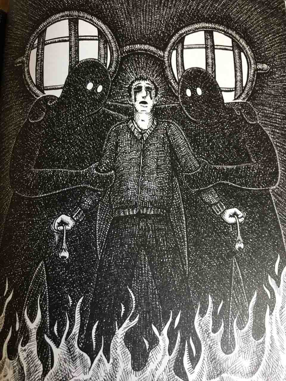 Cet objet rare et très personnel s’avère un magnifique conte noir qui revisite avec brio la fameuse Divine Comédie, prouvant s’il le fallait qu’elle fait bien partie des grandes œuvres humaines intemporelles. Landis Blair de son côté nous subjugue et nous envoûte par son trait hyper-expressif, tout en noirceur, reflétant parfaitement l’univers carcéral du récit (lié en partie à la cécité du personnage principal), où croisillons et hachures recouvrent les pages jusqu’à l’obsession. Ce parti pris autorise les visions les plus cauchemardesques, seuls quelques rares espaces sont concédés à un blanc à peine rassurant. Blair fait preuve d’une expressivité folle et d’une originalité inouïe dans la mise en page.