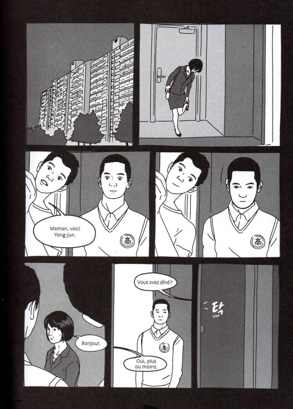 La narration a donc pour trame une relation triangulaire entre une mère, Madame Sang (Mi-Kyeong), son lycéen de fils (Su-hyeon) et l’amant de ce dernier (Yong-jun). Entrecoupée de flashbacks tout au long du récit, l’action au présent se déroule dans l’hôpital où Su-hyeon est dans le coma suite à un accident, alors que son ami, lui, s’en est sorti indemne. Le lecteur va peu à peu comprendre pourquoi l’attitude de Madame Sang a radicalement changé vis-à-vis du jeune Yong-jun, en partie parce que celui-ci s’en est beaucoup mieux sorti dans l’accident mais pas seulement. Totalement bienveillante au départ, elle se montre désormais suspicieuse et peu amène avec lui, lui adressant à peine la parole lorsqu’il vient rendre visite à son fils à l’hôpital. Tout l’intérêt du récit est de dévoiler par petites touches comment leur relation va évoluer, une relation où le silence alternant avec les banalités semblent écraser les mots vrais et la franchise. Yong-jun va-t-il céder aux injonctions de Mi-Kyeong de sortir de la vie de son fils ? Su-hyeon va-t-il enfin se réveiller et quel sera le déclic ? Madame Sang va-t-elle surmonter sa rancune vis-à-vis de Yong-jun et lui pardonner, si tant est qu’il y ait quelque chose à pardonner ?