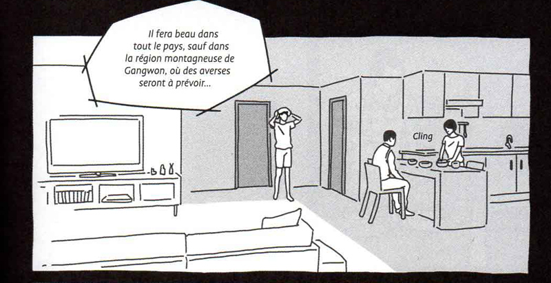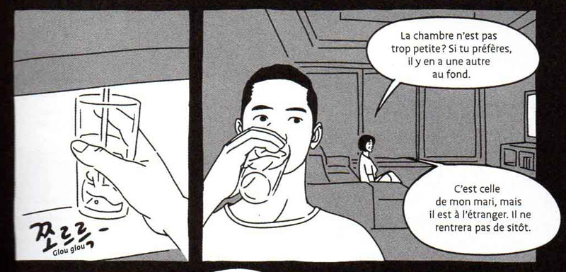 Au premier coup d’œil, on ne peut pas dire que le graphisme paie de mine. A la fois réaliste et minimaliste, la ligne claire sans fioritures de Jeong, qui pourrait faire penser à des illustrations de consignes de sécurité aérienne, respecte pourtant les codes du manhwa basé sur l’art pictural oriental. Un dessin simple et facilement décryptable pour mieux véhiculer le propos. Et à y regarder de plus près, il recèle beaucoup de finesse ce dessin. Il FAUT donc le regarder de plus près, du fait également que les mots ici sont rares. Car l’histoire joue beaucoup sur le non-dit et les sentiments, sur un sujet visiblement encore tabou dans la société coréenne : l’homosexualité. Ce n’est pas tout à fait par hasard si Lee possède aussi la casquette de réalisateur. Les postures et les regards passent au premier plan, les décors n’ayant qu’assez peu d’importance. Le lecteur européen, a fortiori français, pourra à certains moments être décontenancé par certains codes graphiques quelque peu abscons, mais globalement l’exercice est digne d’intérêt. C’est aussi cela une œuvre interactive, qui demande la participation de celui qui la regarde.