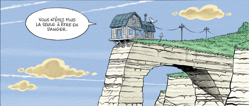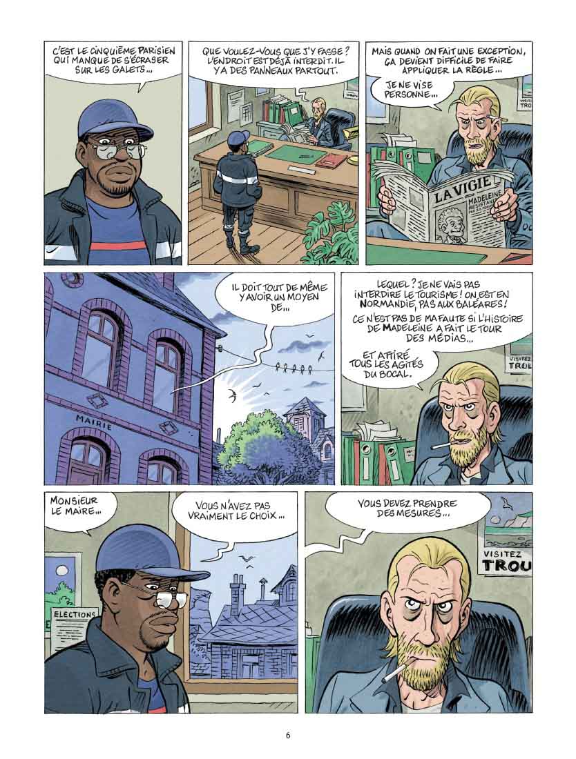Si l’on décide de ne pas s’arrêter aux rebondissements ubuesques de cette aventure très locale – qui se cantonne aux frontières du village imaginaire de Troumesnil dans une Normandie bien réelle —, on comprendra que le récit, pas si innocent, aborde des sujets d’une actualité brûlante, tant en matière environnementale que politique. Le noyau narratif étant la montée des eaux liée au réchauffement climatique, laquelle grignote la falaise où est perchée la petite maison de notre bonne vieille Madeleine, celle-ci continue (comme elle le fait depuis le premier tome) à résister « contre vents et marées » aux injonctions du maire de déménager dans un lieu plus sûr. Mais pour elle, qui pète la forme du haut de ses 91 ans, ce « lieu plus sûr » se traduit par « maison de retraite », ce dont elle ne veut entendre parler à aucun prix. D’autant qu’étant aveugle, elle ne voit pas la menace. Elle, tout ce qu’elle veut, c’est rester peinarde chez elle, entre son chat Balthazar et les souvenirs de feu son mari. Et là, c’est le droit à la fin de vie digne qui est questionné.