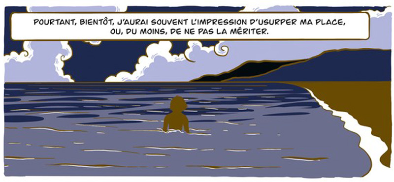 Si la narration bénéficie d’une fluidité agréable, le dessin s’accorde parfaitement avec le propos. Très graphique et aux influences vaguement manga, la ligne claire sage et un brin distanciée n’en révèle pas moins une certaine sensibilité chez son auteur et une élégance que viennent renforcer les couleurs délicates d’une palette restreinte.