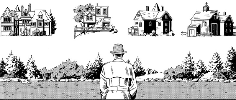 L’inspecteur Brady va donc mener son enquête auprès des principaux suspects, tous voisins de Jones, aucun n’étant vraiment enclins à regretter sa disparition. Des personnages généralement haut en couleurs : un vieil homme un peu ermite vivant dans la ferme de ses ancêtres, sans doute le plus équilibré de tous ; une jeune femme cultivant amoureusement ses plantes aux vertus magiques dans le jardin de sa grande demeure victorienne ; un genre de tête brûlée vissé en permanence sur sa moto tricycle depuis un grave accident qui l’a laissé handicapé, toujours escorté de deux créatures de rêve ; et enfin un sosie mythomane de Clark Gable dénommé Steve Goodrich qui coule une retraite paisible en compagnie de son majordome dans sa luxueuse villa. Quant à l’inspecteur, il apparaît davantage comme un observateur à la fois détaché et mécanique, peu impliqué dans la résolution du crime, pris dans une sorte d’errance onirique stimulée par son don de double vision que permet son fameux troisième œil. Ses visions délirantes jaillissent à la figure du lecteur en état d’hypnose, fourmillant de mille détails à la symbolique surréaliste — on pense parfois à Magritte — matinée de bouddhisme ésotérique, de références chamaniques et de pop-culture, où les contradictions de l’Amérique et ses cauchemars se donnent en spectacle. D’une grande élégance, son trait très réaliste, en apparente contradiction avec le propos, est pourtant totalement assumé par son auteur qui dit lui-même : « J’ai toujours eu l’intention de dessiner les visions avec le même réalisme que tout le reste. Pour moi, traiter l’irréel de façon réelle est l’essence du surréalisme. »