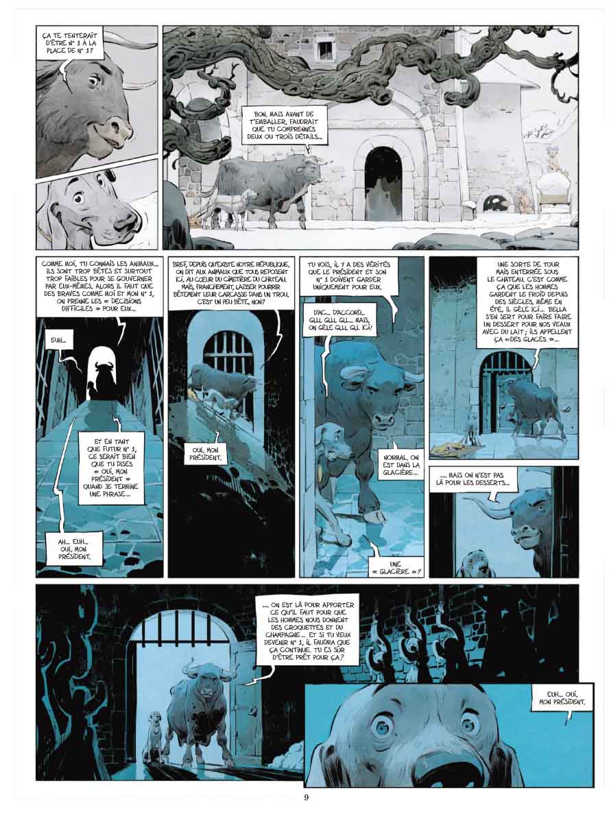 On ne saura reprocher à cette saga la profondeur et la puissance de son message politique, un message universel en résonance avec la situation actuelle, décrivant la façon la plus subtile de faire pression sur les pouvoirs autoritaires, d’autant plus dangereux lorsqu’ils se parent des « plumes » de la démocratie et dénoncent ses adversaires, si pacifiques soient-ils, comme les ennemis ultimes. En d’autres termes, l’art de retourner la situation et de jeter l’huile sur le feu. La soif de domination n’a pas de prix ! L’autre point fort du Château des animaux, purement formel, ce sont bien ses couvertures, toutes aussi réussies les unes que les autres. Alors s’il est un bémol à pointer, certes mineur, il se trouve peut-être du côté de la narration, qui laisse une vague impression de délayage. Deux tomes auraient sans doute suffi pour cette revisite du roman de Georges Orwell, qui est tout de même une sorte de huis clos où le rêve, un vigoureux rêve de liberté, demeure tout du long confiné au périmètre de la ferme. Ainsi on se félicite de savoir que la série verra sa conclusion dans un quatrième et dernier tome, que l’on n’en a pas moins hâte de découvrir !