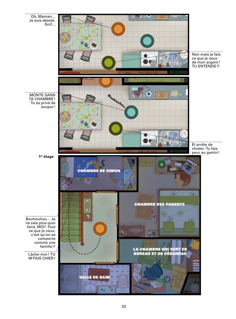 Et si le graphisme est d’une audace incroyable, la narration n’est pas en reste, tant s’en faut, avec un synopsis imparable, digne des meilleurs thrillers, assortie d’un dénouement « WTF » pour le moins inattendu. On est ému par le sort de ce pauvre garçon, Simon, sur qui des mauvaises fées ont dû lancer un sort à la naissance. Issu d’un milieu familial défavorisé, souffrant d’obésité et harcelé par les petites frappes du voisinage, Simon aura toutefois cette « chance » d’avoir joué les bons numéros au tiercé sur les bons conseils d’une voyante à qui il ramène les courses en échange d’un pourboire. Mais quand on ne nait pas avec les bonnes cartes en main, même un coup de fortune comporte des revers… Putain de destin ! Le jeune garçon va se voir entraîné dans une spirale infernale que son statut de mineur va compliquer (non majeur, il ne pourra percevoir les gains sans l’aval de l’un de ses parents) et qui va lui faire perdre les dernières illusions de l’enfance. Car en effet, cette histoire de ticket gagnant placera Simon aux premières loges d’un spectacle peu glorieux, celui du monde des adultes où méchanceté, violence, convoitise et cupidité en seront les principaux protagonistes, où la couleur des choses prend souvent une teinte glauque.