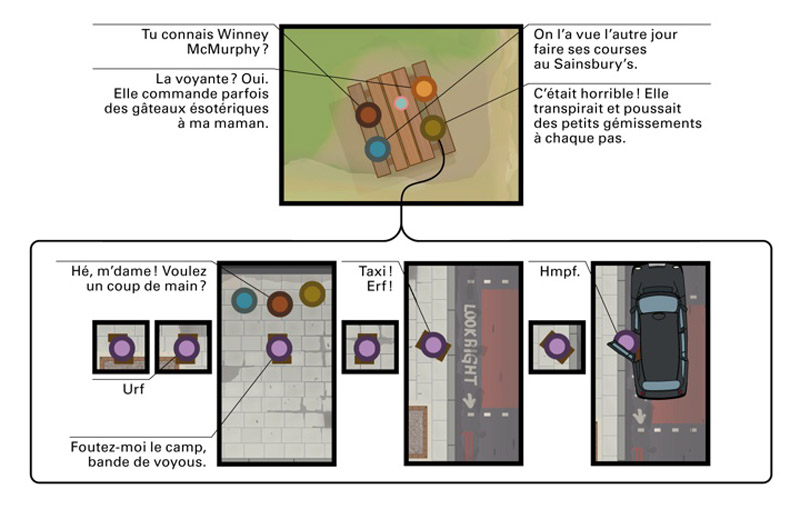 Avec cette œuvre extrêmement ludique qui n’en est pas moins une peinture sociale édifiante de l’Angleterre contemporaine, dotée d’un humour discrètement acerbe, Martin Panchaud, auteur suisse tout juste quadragénaire, prend un malin plaisir à brouiller les codes du neuvième art par une lecture en vue aérienne, en substituant par exemple des plans de maison aux cases, en inventant une nouvelle iconographie par l’insertion de pictogrammes, représentations graphiques et divers symboles au milieu d’un déroulé narratif qui s’autorise toutes les fantaisies. Le résultat est véritablement bluffant, plaçant l’objet quelque part entre la pièce de théâtre, le jeu de plateau et l’appli de smartphone.