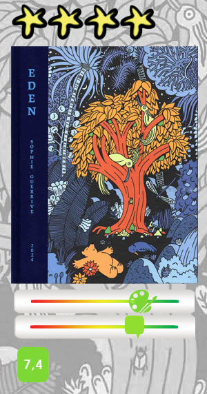 Sous ses faux airs de conte pour enfants, Eden est un peu plus que ça. Si Sophie Guerrive reprend le personnage de Tulipe, l’ourson stoïcien avec qui on a fait connaissance dans ses précédents ouvrages « jeunesse » (également publiés chez 2024), cet opus conserve la même fraîcheur et le même humour léger pouvant évoquer un Charlie Brown en plus lunaire, avec en outre une réflexion métaphysico-religieuse qui risquerait toutefois de paraître plus absconse aux plus jeunes. Ainsi, l’autrice de Capitaine Mulet nous propose un charmant voyage plein de fantaisie que vient renforcer son dessin à la fois naïf et graphique aux couleurs simples. Elle y dissémine de petites mignardises philosophiques pleines de sagesse qui se dégustent sans que cela nous reste sur l’estomac.