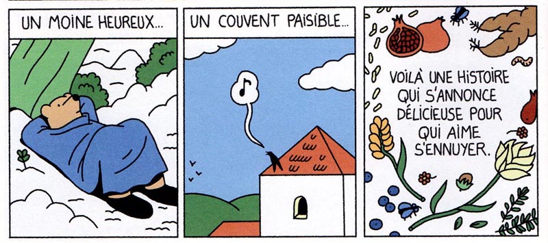 Frère Tulipe est un moine heureux mais se sent parfois à l’étroit dans son couvent trop paisible. Il rêve de voyages et de découvertes. Mais Frère Cosmos, le prieur, n’apprécie guère les âmes libres et use de ses jolis sermons pour retenir ses ouailles. Pour lui, « les paradis ne sont paradis que parce qu’ils sont perdus ». Mais un beau jour, Frère Tulipe, en quête de vérité, décide de quitter le couvent pour un très long périple vers l’Orient.
