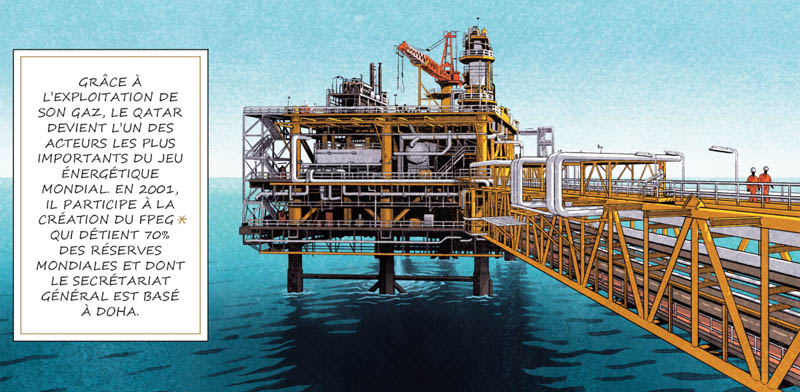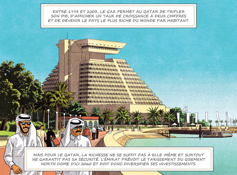 Le livre, judicieusement divisé en plusieurs chapitres concernant les aspects politiques et économiques, débute par un rappel historique sur les origines du Qatar, Ce que montre très bien ce docu-BD, c’est la complexité géopolitique inhérente à cet État, coincé entre une Arabie saoudite qui a longtemps été l’interlocuteur privilégié des USA dans la région, et les Émirats arabes unis rivaux (Dubaï devance encore largement Doha en matière d’attractivité touristique), sans parler d’une situation souvent explosive hors des frontières de ces pays, où guerre, terrorisme et pauvreté semblent endémiques.
