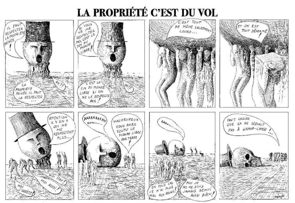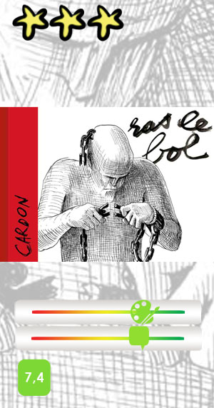 Par un trait hachuré souvent au bord de l’esquisse, Cardon joue beaucoup sur la métaphore et l’onirisme, conférant ce côté intemporel, mais intègre parfois des faits d’actualité d’une époque déjà lointaine (eh oui !), ce qui pousse Ras le bol vers une certaine désuétude et risque aussi de rendre le propos quelque peu sibyllin. On ne sait jamais vraiment si l’auteur cherche à nous faire rire avec ses historiettes un peu lunaires, et il arrive que les chutes soient un peu trop abruptes ou tombent à plat, mais s’il est question de rire, celui-ci est forcément jaune. Pourtant il faut bien l’avouer, l’ensemble dégage quelque chose d’assez puissant, justifiant pleinement cette anthologie qui constitue autant un document historique qu’une invitation renouvelée à briser ses chaînes dans le contexte actuel de régression sociale.