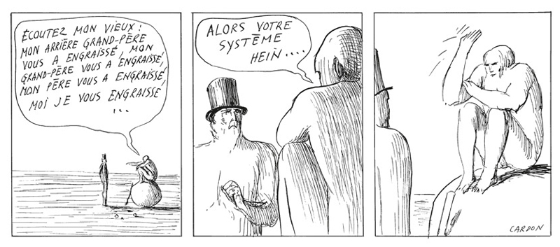 Si Cardon devait commenter la vie politique française actuelle, exprimerait-il toujours son ras le bol ? Assurément, oui, et d’ailleurs cette anthologie regroupant sa production des seventies nous démontre que si tout a changé, rien n’a changé…