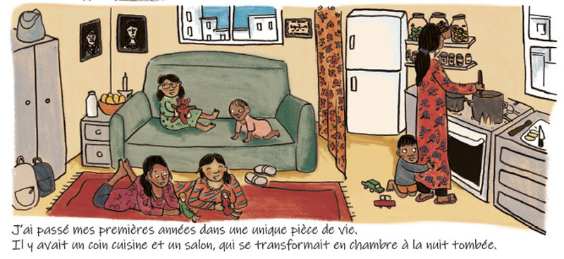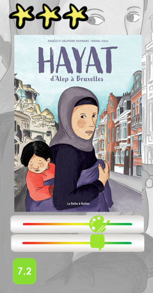 Si le dessin de Delphine Hermans peut sembler un peu scolaire, il se fait vite oublier du fait qu’il va à l’essentiel pour mieux servir le récit qui lui, reste très fluide et assez captivant. Les quelques maladresses du trait un peu fragile sont compensées par une mise en page simple et variée et des couleurs pleines de fraîcheur, conférant un certain dynamisme à cette histoire au demeurant plutôt ordinaire d’une famille syrienne. Il ne faudra pas chercher ici de dramaturgie lacrymale. Non, ce que raconte Hayat, c’est juste le récit « banalement dramatique » mais pas pour autant plombant d’une « primo-arrivante » en Europe, ce qui permettra peut-être au lecteur de se mettre plus facilement dans la peau de ces personnes, souvent vues dans les journaux télévisés comme les simples composants d’un flot anonyme et déshumanisé. La narration est une sorte de synthèse à partir de plusieurs témoignages recueillis par les scénaristes Anaële Hermans (sœur de la dessinatrice) et Manal Halil, elle-même d’origine syrienne, dans le cadre de leur fonction de formatrices dans un bureau d’accueil.