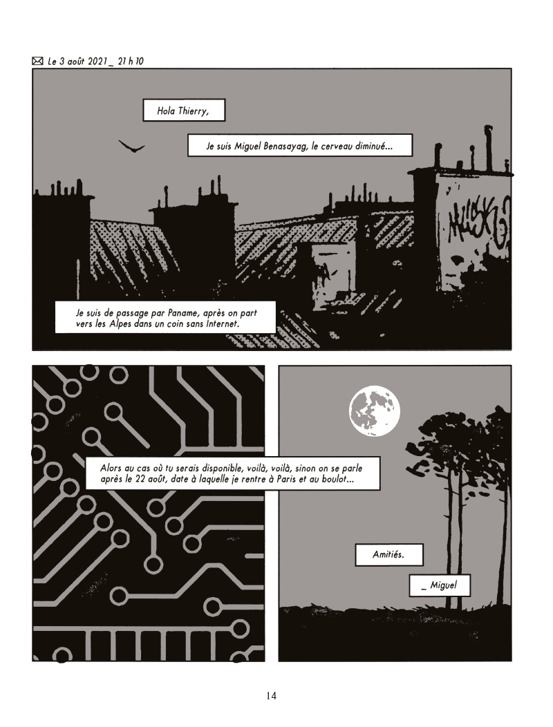 De prime abord, il pourrait paraître surprenant de voir Thierry Murat aborder un genre auquel il ne nous a pas habitués : l’essai socio-philosophique. L’homme est plutôt coutumier de fictions intemporelles traitées sur un mode poétique, avec pour fil rouge le rapport de l’Homme à la nature. Et pourtant, à y regarder de plus près, cela s’avère plutôt logique. Le projet de cette bande dessinée est à sa seule initiative. C’est lui qui a contacté Miguel Benasayag après avoir lu son essai, lui proposant d’en faire le « prolongement graphique ». Dans son livre, Benasayag traite peu ou prou, même si son approche est beaucoup plus rationnelle, des thèmes irrigant l’œuvre de Murat, à savoir : notre lien perdu à la nature dans notre course au progrès. Plus concrètement, le philosophe essayiste nous alerte dans son ouvrage des dangers liés au rêve scientifique de concevoir le cerveau « parfait » en l’envisageant plus ou moins comme un ordinateur.