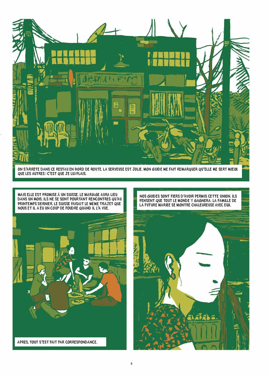 Ce délicat roman graphique aborde la question du tourisme sexuel de façon originale, en optant pour une narration à quatre voix, une par chapitre : d’abord le jeune homme du début, la proxénète, puis le quadragénaire célibataire et enfin Duyên. Choix original, par la multiplicité des points de vue, favorise l’empathie du lecteur en évitant tout ethnocentrisme. Et c’est le gros point fort de l’ouvrage, qui nous fait voir au-delà des apparences, nous montrant que les gens ne correspondent pas forcément à l’image qu’ils donnent, et que, finalement, d’un bout à l’autre de la planète, les aspirations humaines demeurent toujours les mêmes malgré les différences culturelles. En résumé, ce récit nous transmet un très beau message empreint d’optimisme malgré l’âpreté de certaines scènes.