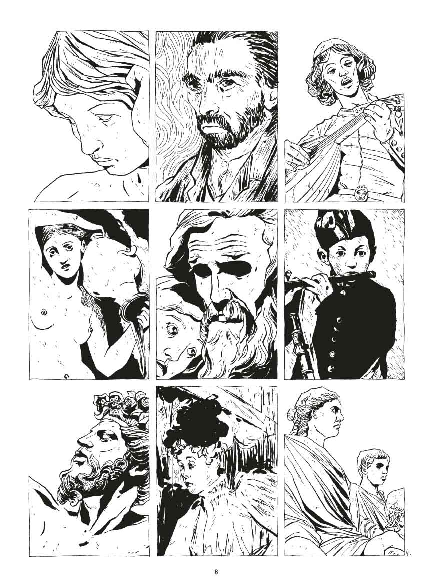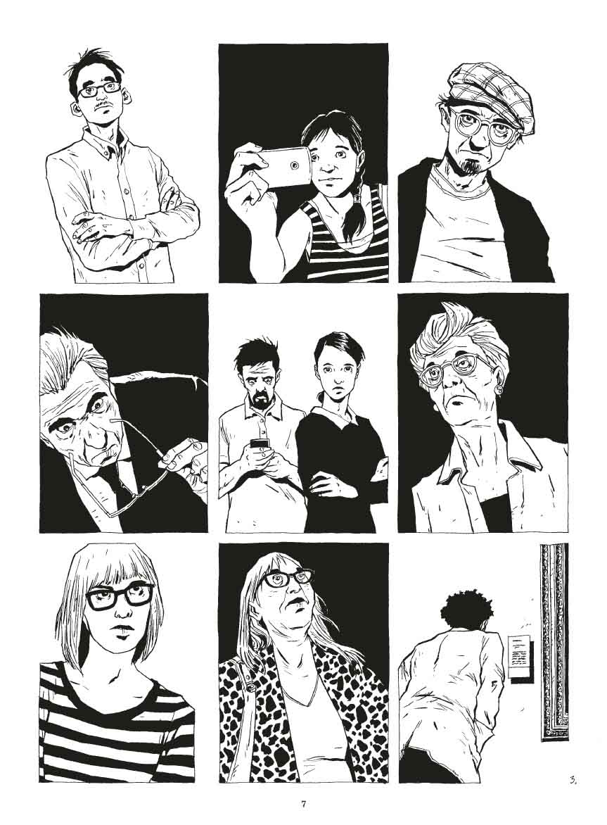Et on peut dire qu’il s’en sort plutôt bien. Graphiquement parlant, il ne déroge pas à son style habituel et confirme sa maitrise du N&B, alliée à un trait tout en finesse et une mise en page efficace où chaque plan souligne un détail significatif. Chabouté n’a plus rien à prouver à ce niveau. La narration éclatée, assemblage de saynètes, agit comme un miroir déroutant où les rôles sont inversés : le sujet se fait objet, l’observateur (le visiteur du musée) devient l’observé, tandis que les œuvres d’art (on va le comprendre très progressivement, au bout d’une cinquantaine de pages muettes et atmosphériques) vivent leur propre vie (la nuit, une fois que les portes se sont refermées) et y vont de leurs commentaires, parfois moqueurs, parfois candides, sur le monde des humains de chair et d’os. C’est finement observé et plein d’humour, de sensibilité et de poésie, d’intelligence et d’érudition, et il est difficile de ne pas tomber sous le charme. On pense parfois à Jacques Tati, et on se dit que ce dernier aurait pu très bien faire un film sur le sujet…