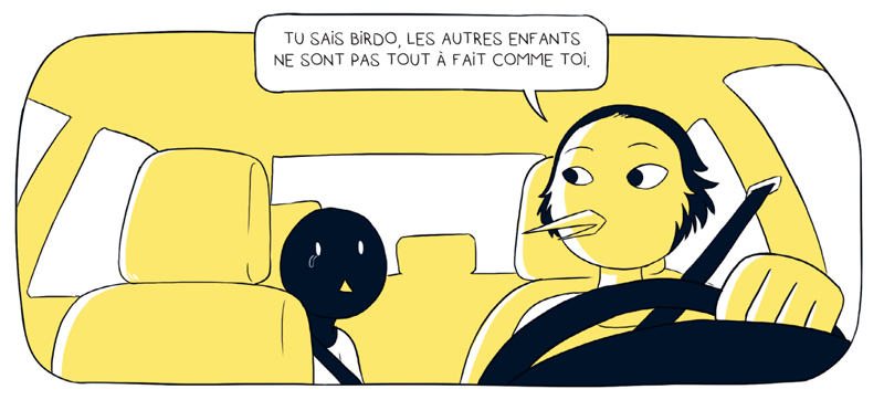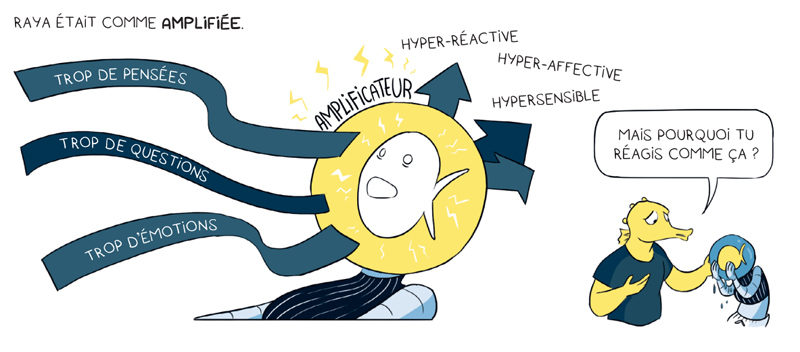 Le dessin très minimaliste, sous ses allures gentillettes, peut donner l’impression de viser un public jeune, mais il dissimule en réalité un propos très adulte, et accessoirement des conseils judicieux aux parents concernés. Car les paroles vis-à-vis de ces enfants hypersensibles auront une importance capitale dans leur construction. Par exemple, une simple inversion des sujets résonnera de façon très différente. Dire, comme le fait avec intelligence la mère de Birdo : « Les autres enfants ne sont pas comme toi » au lieu de « Tu n’es pas comme les autres », n’aura pas tout à fait le même impact dans la tête de la progéniture… Sur le plan du dessin encore, Lou Lubie sait insuffler une poésie délicate (qui révèle de fait sa grande sensibilité), avec cette image originale, peut-être déroutante mais très parlante, d’un bocal renfermant un poisson en guise de tête pour le personnage de Raya.