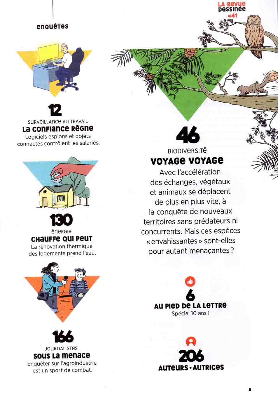 Parmi les autres sujets abordés dans cette 41e parution, un reportage en Une qui montre que la situation dans les prisons françaises est loin de s’améliorer, avec une violence endémique « qui contamine tout le monde », ainsi qu’une enquête sur les fameuses espèces « envahissantes » qui tente de dédramatiser cette nouvelle psychose environnementale pas toujours justifiée. Plus inquiétant, le thème de la surveillance au travail à travers les logiciels espions, une pratique sournoise qui s’est accentuée avec le télétravail et pourrait concerner bon nombre de salariés. Enfin, un constat désolant sur la mise aux normes énergétiques du parc immobilier français, que le double langage des instances gouvernementales cherche à enjoliver.