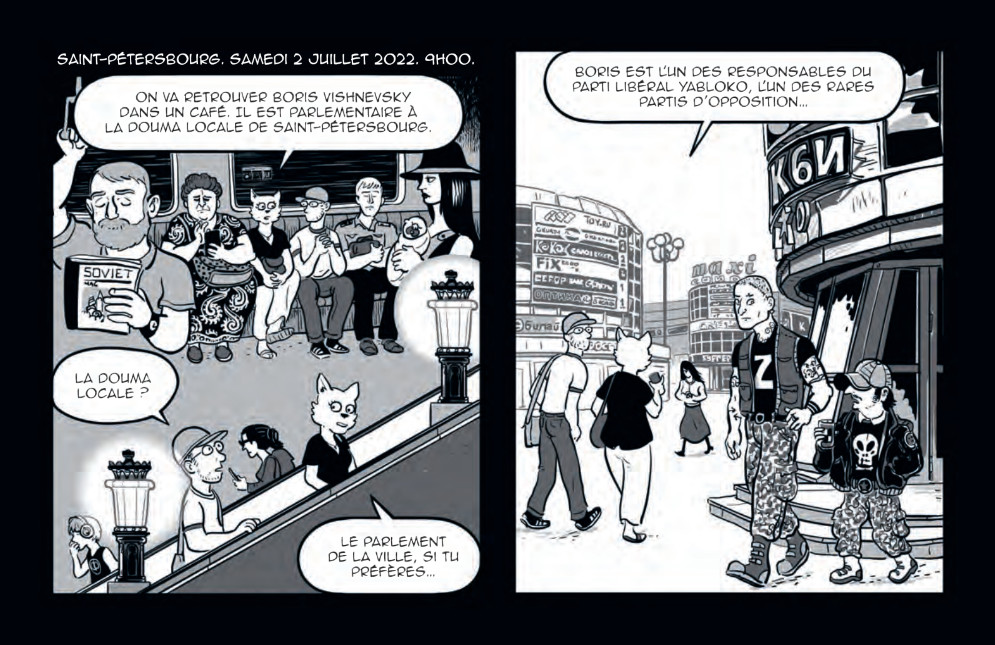 Parce que comme on s’en doute, l’auteur avait besoin d’une « fixeuse », ne pouvant guère se promener librement pour interroger qui bon lui semblait dans un tel contexte, même si Saint-Pétersbourg, son point d’atterrissage en Russie, ressemble plus aujourd’hui à n’importe quelle ville occidentale qu’à la Leningrad de l’ex-URSS. En apparence seulement, bien sûr… et notre frenchie va s’en rendre compte très vite, puisqu’au fil de ses rencontres plus ou moins aléatoires, il constatera que la répression a redoublé à l’encontre des opposants politiques et de tous ceux qui ne rentrent pas dans le rang depuis le début de la guerre. Il y a par exemple Anna, la jeune artiste et activiste LGBT, Elena, « la grand-mère de l’opposition », ancienne professeur d’arts plastiques et devenue célèbre sur les réseaux à force de se faire embarquer au poste, mais aussi Loubna, la « chanteuse patriote », rencontrée par hasard via sa mère dans le train vers Moscou. Consciente d’une certaine mainmise du maître du Kremlin sur les médias, la maman semble pourtant accepter la situation, peu encline à s’exprimer (par peur, déni ou indifférence ?), tandis que Loubna, qui adore chanter du Lara Fabian, veut rejoindre l’armée si elle ne réussit pas dans la musique. Son rêve ultime : acquérir sa datcha « en lisière de forêt »…
