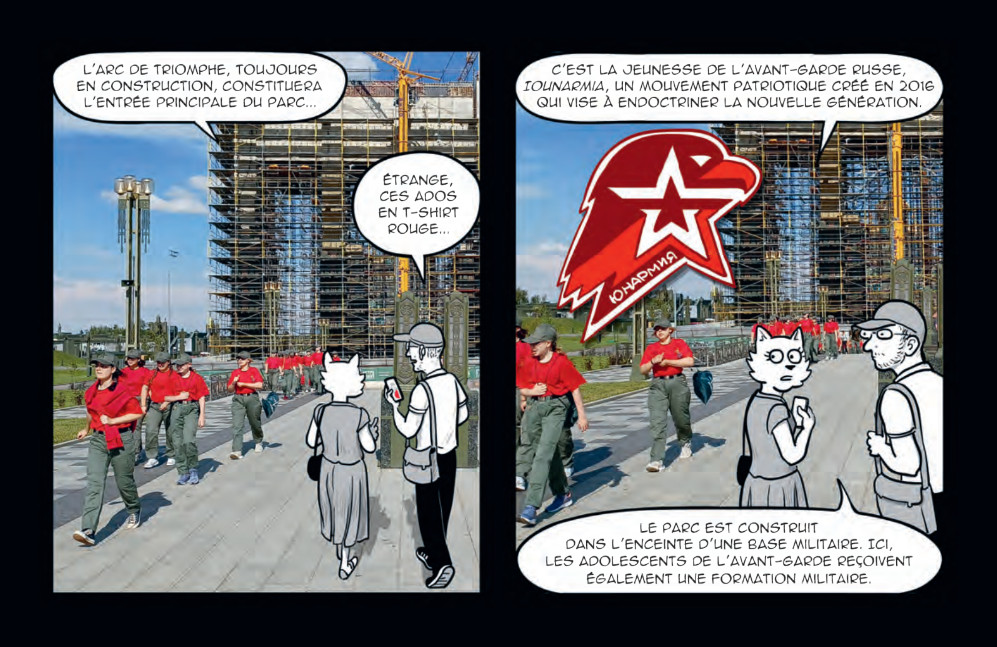 Ce docu instructif se conclut sur le mégalo-projet édifiant de Poutine plombé par le Covid, le « Parc des patriotes ». On n’en dira pas plus, mais cette dernière image nous fait ressortir consternés de cette lecture, à l’image de Nicolas Wild qui se sépare de sa fixeuse comme s’il venait d’avaler à lui tout seul une marmite entière de bœuf Strogonov. Au final, on n’est pas vraiment sûr de ce que pensent les Russes, mais on constate qu’ils n’en pensent pas moins et que surtout, ils ne sont pas si différents de nous, Européens…. Et s’il le fallait, cet ouvrage ne fait que prouver que le docu-BD, plus furtif et donc, d’une certaine manière, plus redoutable pour les puissants, n’a plus grand chose à envier aux traditionnels reportages photographiques, écrits ou audiovisuels.