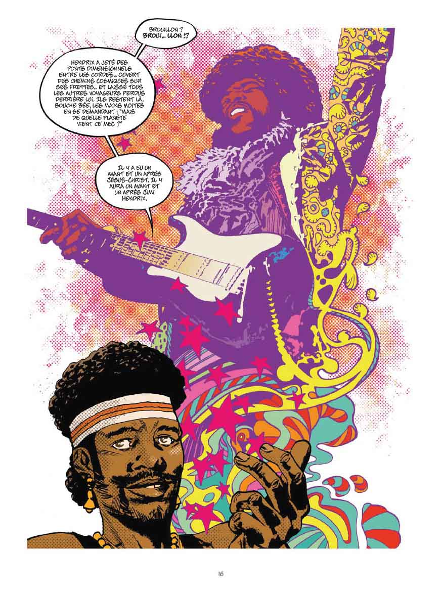 Charlie Adlard a su très bien rendre cette atmosphère, et à vrai dire, on ne peut s’empêcher de redouter l’apparition d’un zombie à chaque page. Son trait nerveux et acéré, qui confère toujours beaucoup d’expressivité aux personnages, honore avec talent les grands artistes de la scène rock et jazz de l’époque. C’est tout juste si on entend par leur musique se diffuser à travers le grain du papier. A son style habituel, il a inséré des touches de psychédélisme et de pop-art (avec ce tramage inspiré de Roy Lichtenstein). L’utilisation de la couleur évolue au fur et à mesure que la catastrophe sous-jacente se précise. Plus vives au début pour évoquer le soleil californien, les tonalités s’assombrissent peu à peu, et ce n’est pas seulement du fait de la météo maussade mais aussi pour illustrer les mauvaises vibrations qui imprégnaient alors le festival.