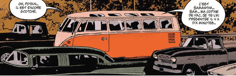 Mais le personnage central est incontestablement Matt, alias le Doc, qui tout au long du récit en impose par sa présence silencieuse et énigmatique. Caché derrière ses lunettes noires, il pose sans relâche ses états d’âme sur son carnet de notes, comme pour domestiquer la folie et le traumatisme engendrés par la guerre du Vietnam dont il est revenu récemment. De plus, il ne s’est toujours pas remis de la mort de son pote Mike, emporté sous ses yeux par une overdose.