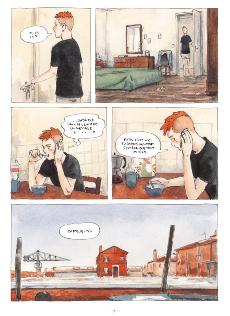 C’est aussi une galerie de personnages intéressants que le jeune héros va croiser. D’abord ce vieil homme réfugié sur son rafiot échoué, l’Ancêtre, parce qu’il ne supporte plus de voir ce qu’est devenue la lagune, défigurée selon lui par le tourisme, lui qui se dit « gardien du passé ». Puis son grand-père, qui se sent comme en prison dans sa maison de repos et ne semble attendre que la mort. Enfin, il y a Shaza, réfugiée syrienne comme Ahmad, qui a choisi de faire sienne la sentence de sa mère restée au pays : ne jamais se retourner. C’est en elle que Paolo va trouver un peu de réconfort et renforcer peut-être sa détermination à fuir l’enfer… Progressivement, la vérité sur son père va se révéler au fil de sa quête, une vérité bien amère qui lui fera abandonner les dernières illusions de son enfance…