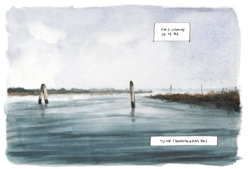 Le scénario de Christophe Dabitch est parfaitement maîtrisé, et le dessin de Piero Macola se montre à la hauteur. Le livre s’ouvre sur des vues impressionnistes de la lagune dans une aquarelle fort logiquement détrempée, dans des tonalités de gris-bleu pâle, estompant les contours des éléments du paysage. Quant aux personnages, ils restent dans l’esquisse, Macola ayant mis l’accent sur les expressions et les attitudes, très réalistes, qui rappellent beaucoup le travail de Gipi. Si l’atmosphère générale et l’imprécision du trait peuvent paraître au premier abord peu engageants, ils ne font que restituer la monotonie du quotidien dans cette lagune qui tranche avec Venise. Mais au fil des pages, ce monde flottant, vaporeux et un rien sinistre va révéler ses trésors d’ombres et de lumières, que les ambiances nocturnes mettent encore davantage en valeur.