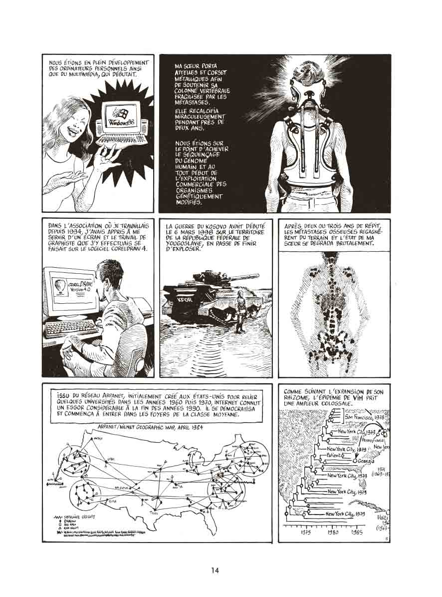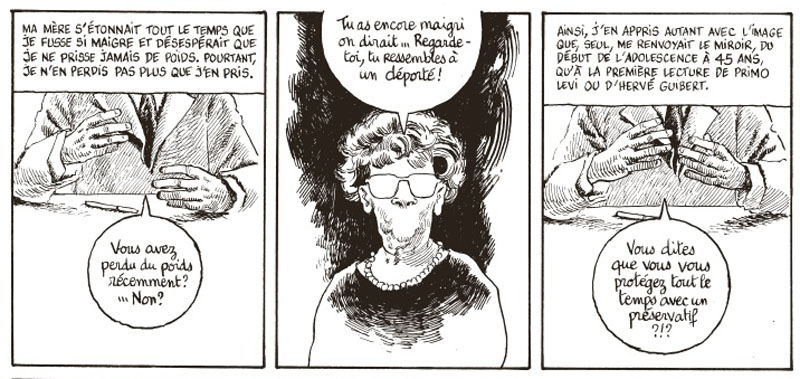 Au milieu de ses coutumières errances nocturnes dans les parcs en quête d’un bon coup (l’occasion de questionner encore et toujours la visibilité réduite des lieux de rencontre entre hommes au tournant du millénaire, et ce malgré une évolution certaine des mœurs), Neaud évoque de nombreux sujets qu’il serait impossible à détailler ici. Il revient sur la mort de sa sœur et de son père, tous deux atteints d’un cancer, et subséquemment de son hypocondrie croissante dans un contexte où le Sida faisait encore des ravages. Par transition, il questionne le poids des relations familiales avec cette « loi du silence » imposée par une mère à la fois peu aimante et étouffante. Celui à qui on reprochait de ne pas respecter le droit à l’image dans les tomes précédents fait preuve ici d’une retenue qui peut poser question : en effet, ni sa sœur ni sa mère (et encore moins son père, qu’il n’a jamais revu après le divorce parental) ne sont portraitisés, ou alors en silhouette ou de façon partielle. Par pudeur peut-être, ou par souci de ne pas réveiller des plaies douloureuses ?