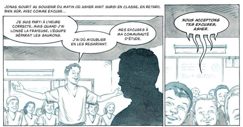 Une fois le malaise installé, car ce monde sous cette perfection des apparences est véritablement terrifiant, le récit va évoluer vers la prise de conscience progressive de Jonas lorsqu’il commencera sa formation pour devenir le nouveau receveur de mémoire de la communauté, et en parallèle les couleurs, associées aux émotions, vont peu à peu prendre le dessus et serviront de marqueur entre le monde connu du jeune garçon et l’« ailleurs » qu’il aspire à connaître.