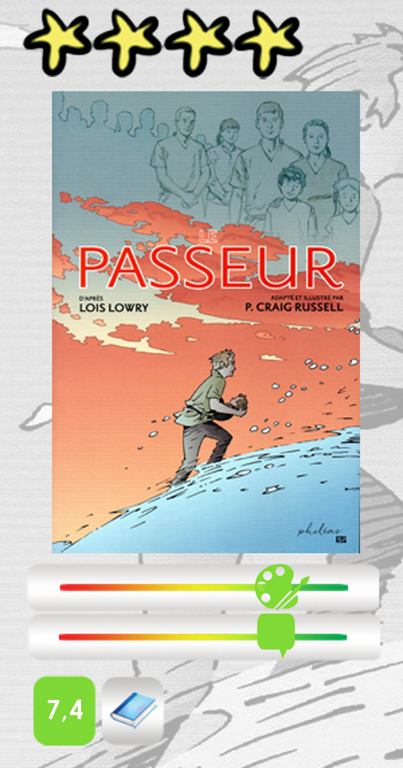 Philip Craig Russel a fait du roman une adaptation plutôt convaincante, même si la narration souffre de quelques longueurs, surtout au début, et prend un certain temps à trouver son rythme. Malgré sa finesse, le dessin reste lisse et la quasi-absence de couleurs accentue l’impression de monotonie mais cela correspond pourtant tout à fait au sujet comme on le réalisera par la suite. Par moments, l’univers évoque les vieilles publicités des années cinquante auxquelles on aurait retiré toutes les couleurs. D’ailleurs curieusement, la technologie est très peu présente dans cette histoire, ce qui lui confère un côté intemporel et permet de mettre en avant une réflexion philosophique sur un sujet vieux comme le monde : la place de l’individu au sein d’un système totalitaire.