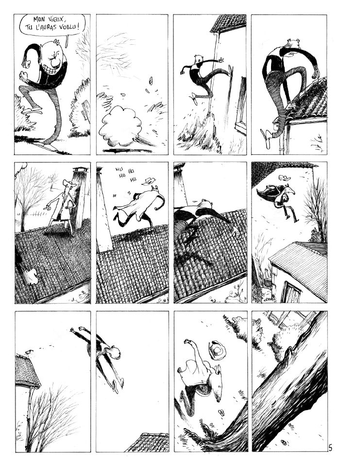 A l’avenant, le dessin volontairement mal fichu est un sommet de drôlerie. On l’oublie souvent, mais il faut un certain talent pour réussir à faire passer des émotions (ici en l’occurrence le rire) en deux coups de crayon, et Bouzard n’en manque pas. Dans la même catégorie, on pense d’abord à Reiser, dont le trait « moche et vulgaire », associé à une irrévérence féroce, a fait les beaux jours d’Hara-Kiri et du Charlie Hebdo des débuts. A la différence que Bouzard utilise pleinement les codes du neuvième art pour décupler les fous rires auprès de son lectorat. La mise en page en gaufrier, loin d’être une contrainte pour l’auteur, ne fait que renforcer le dynamisme narratif, en contrepoint d’anecdotes qui sans cet humour hypra décalé seraient désolantes de banalité. A cela vient s’ajouter un sens du mouvement très cartoonesque qui n’aurait pas tout à fait la même puissance comique sans ledit gaufrier. Il suffit pour s’en rendre compte de se reporter à la page 164, avec cette scène où notre (anti-)héros poursuit son clébard dans les arbres (volume 3 – The Autobiography of me too free), l’air de rien c’est du grand art. On n’oubliera pas de parler des expressions des visages hilarantes, dont certaines carrément « what the fuck », la plupart du temps empreintes de lassitude, de goguenardise ou de colère, c’est tout bonnement irrésistible !