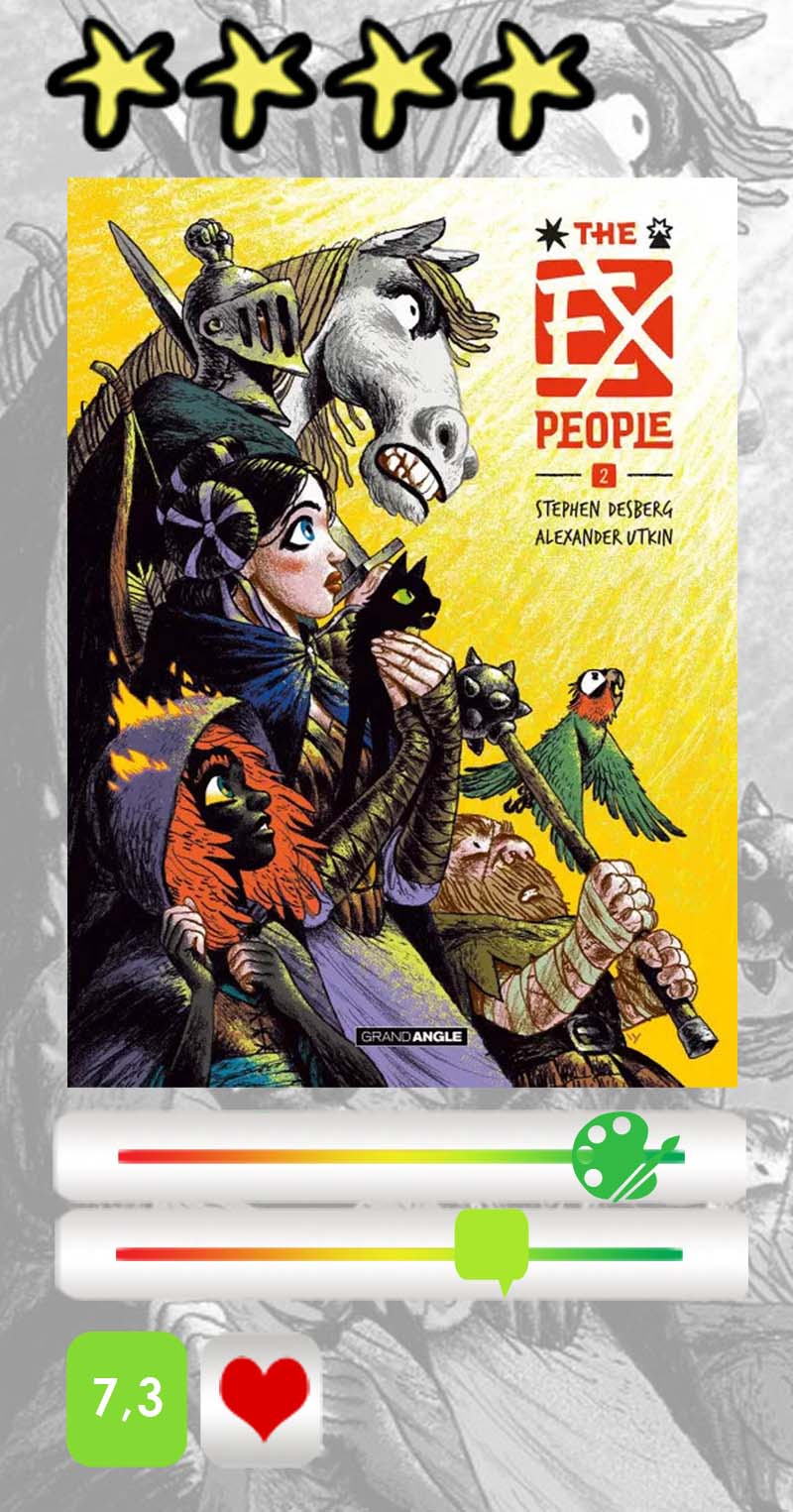 Comme pour Le Roi des oiseaux, Alexander Utkin a su retranscrire avec ses pinceaux la féérie du récit, et ils ont assurément quelque chose de magique, ces pinceaux ! Certains ne manqueront pas de juger le trait un peu naïf, qui défie les proportions et semble parfois grossier. Blaise, l’écuyer casqué, a une tête bien trop petite (ce qui néanmoins est logique puisqu’il n’a jamais pu retirer son casque depuis l’enfance) par rapport au corps, et ses membres sont bien trop longs. Et pourtant, cela n’est aucunement gênant puisque clairement c’est un parti pris de l’artiste, qui lui permet d’amplifier le mouvement et confère un certain dynamisme à la narration. Que l’on apprécie ou pas, tout cela est largement contrebalancé par une palette de couleurs tout à fait unique, qui nous avait déjà époustouflés dans Le Roi des oiseaux. On aimerait savoir combien de temps Utkin passe à rechercher la bonne nuance de tonalité, mais on aurait presque l’impression que ses champs chromatiques sont infinis ! De plus, des couleurs très diverses sont juxtaposées de façon très harmonieuse. Ce chamarrage original et surprenant explose dans la rétine et émerveille l’âme.