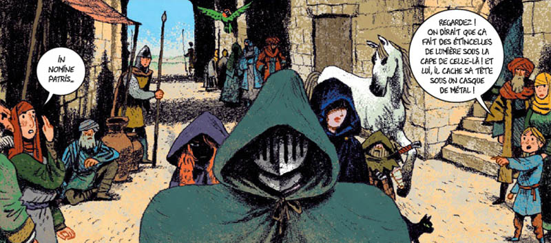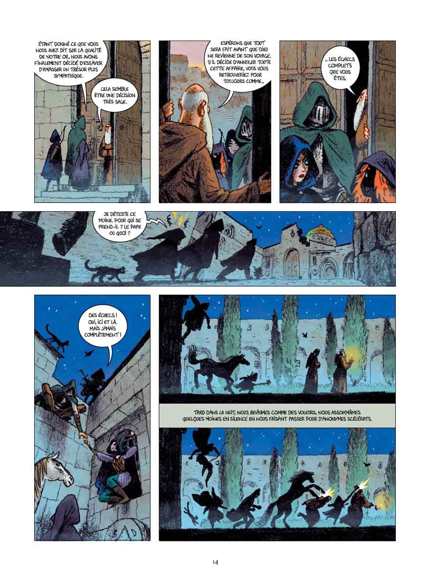 Du point de vue de la narration, le premier volet est très bien mené, expliquant ce qui a conduit ces fantômes parias à s’unir sous la houlette de Blaise et Gertrude pour entreprendre une croisade vers Jérusalem, où ils pourraient trouver un moyen de se défaire du sortilège qui les accable. On pourra toutefois regretter un certain essoufflement en seconde partie et une fin un peu confuse, ainsi qu’une légère incohérence qui voit Pervenche l’archère affectée comme ses compagnons d’une malédiction, mais une malédiction très particulière qui menace de la tuer – moi qui pensais que les fantômes ne pouvaient pas mourir une seconde fois, serais-je un peu tatillon du conte ? Bref, cela n’est pas non plus si gênant, mais même si le registre fantastique autorise toutes les libertés, on aurait aimé avoir plus d’éclaircissement sur cet aspect du récit, celui-ci s’avérant en fin de compte assez vain.