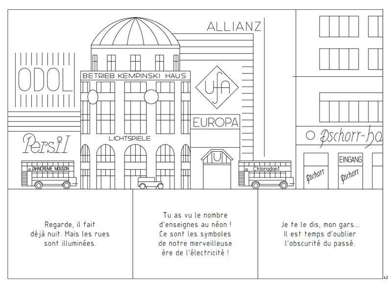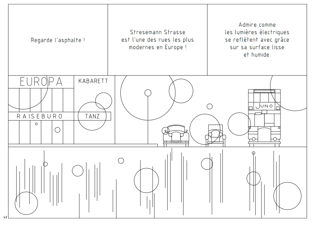 Alors bien sûr, quand on feuillette, on peut avoir un mouvement de recul. Ces fines lignes droites hyper minimalistes, hyper millimétrées, ont un aspect froid et pas très engageant pour tout puriste de la bande dessinée, mais il ne faudrait surtout pas s’arrêter à ça, car cet album recèle bien d’autres qualités, notamment son graphisme original. Pour ceux qui ont lu Soleil mécanique, l’effet de surprise sera amoindri mais le parti pris reste toujours aussi fascinant par son audace confinant à la poésie, où les dessins froidement architecturaux, tendance art déco, semblent tisser une passerelle vers un art abstrait empreint d’émotion. On s’habitue très rapidement aux codes de lecture innovants, qui voient les phylactères ne faire qu’un avec les cases.