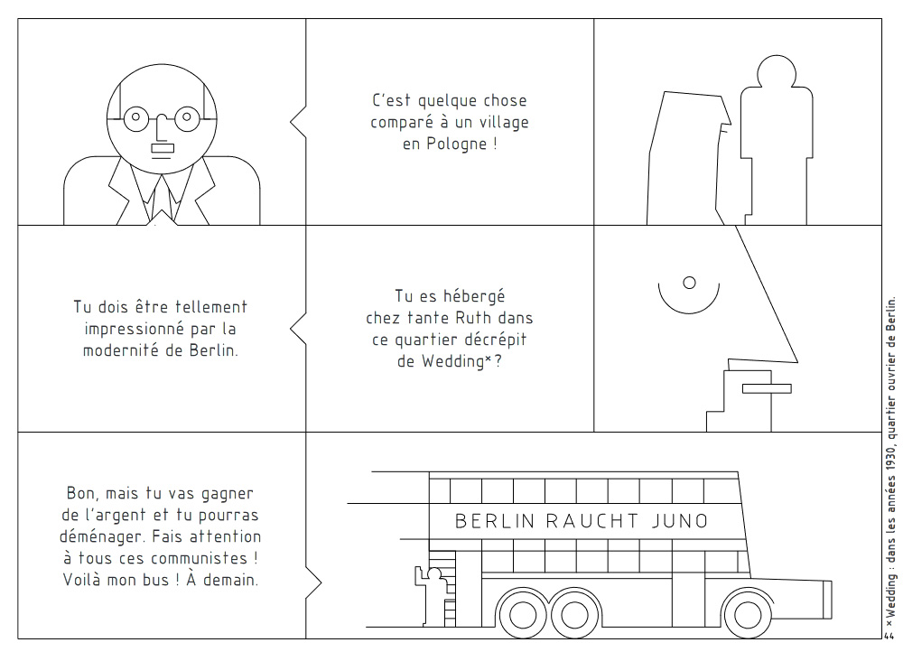 Pour contrebalancer cette « sécheresse » graphique, Wojciechowski réussit à produire un récit extrêmement accessible, profondément humain, à partir d’une histoire familiale tragique. Stanislaw, personnage en apparence insignifiant et docile alors qu’il vient d’être embauché par le bureau d’étude où bosse son oncle, est aussi le narrateur. Après le travail, il traine sa solitude dans les quartiers mal famés de Berlin. On le voit alors en proie à des accès de violence, lui le Polonais expatrié et confronté au racisme en pleine montée du nazisme, évoquée en filigrane dans l’histoire. Au fil des pages, le lecteur va découvrir que ces colères incontrôlables s’expliquent par un traumatisme profond et incurable remontant à l’enfance, et là selon l’expression consacrée, c’est la petite histoire dans la grande Histoire… avec des références explicites au Cabinet du docteur Caligari et au Golem deux films expressionnistes allemands de 1920 exerçant une grande fascination sur Stanislaw, peut-être par leur côté visionnaire. Dans le premier, il est question de tyrannie et d’obéissance aveugle des foules à l’autorité. Le second raconte l’histoire d’un rabbin qui conçoit un monstre dans l’espoir d’en faire son serviteur mais aussi le sauveur de la communauté juive…