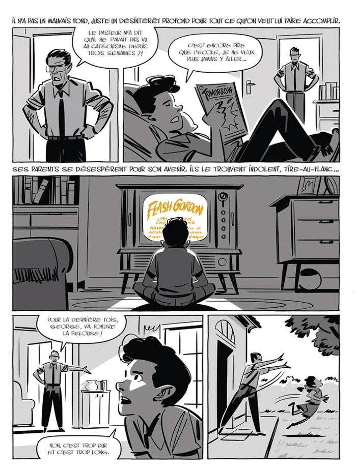 Abondamment documenté, l’ouvrage a été mené de main de maître par les deux auteurs, avec une symbiose parfaite entre les partitions graphique et narrative. On y découvre d’abord le personnage de Georges Lucas, cet enfant rebelle dont les rêves étaient « bigger than life ». L’homme, déjà tout gosse, avait une personnalité hors du commun, tête brûlée dans son adolescence et plutôt renfermé, il semblait habité par une volonté de fer pour donner corps à ses rêves…et il lui en aura fallu de la volonté pour franchir les innombrables écueils qu’il subit avant la sortie en salles du film, dans la douleur qui plus est… Même si Lucas avait déjà sa trilogie en tête, c’est le succès inattendu de ce premier opus au box office qui fut le catalyseur de l’impressionnante saga et de ses innombrables spin-offs, très inégaux il faut bien l’avouer, que nous connaissons aujourd’hui.