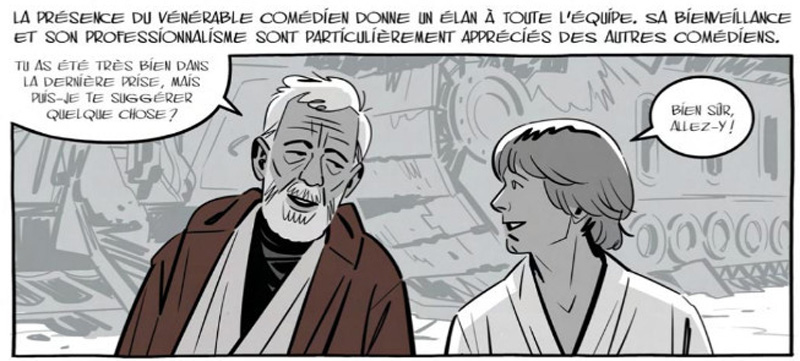 C’est avec bonheur que l’on avale les 200 pages du livre, qui, en plus d’un personnage à la « vie intérieure bouillonnante », nous dévoile la genèse du tout premier Star Wars. On découvre que la compagne de George, Marcia, aura été d’un énorme soutien dans l’aboutissement de son projet, remanié mille fois avant sa version définitive ! Si les relations furent souvent houleuses avec les producteurs de studios, davantage préoccupés par l’appât du gain, celles avec les cinéastes furent heureusement plus amicales. On y croise ainsi Francis Ford Coppola, Steven Spielberg, l’autre homme qui aura transformé le cinéma dans ces années-là, Irvin Kershner (qui à l’époque n’avait pas encore réalisé L’Empire contre-attaque), Martin Scorsese et d’autres. Et puis les acteurs bien sûr, le trio magique composé d’Harrison Ford (recruté par défaut !), Carrie Fisher et Mark Hammill, mais aussi les seconds rôles, notamment l’acteur britannique Alec Guinness qui aura apporté son aura bienveillante au film.