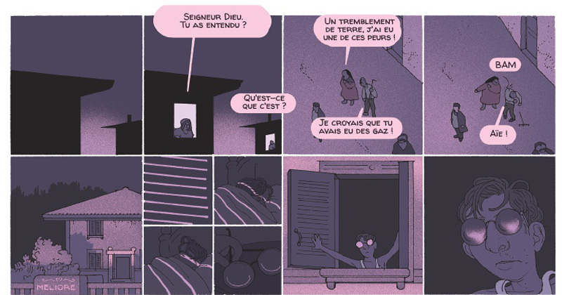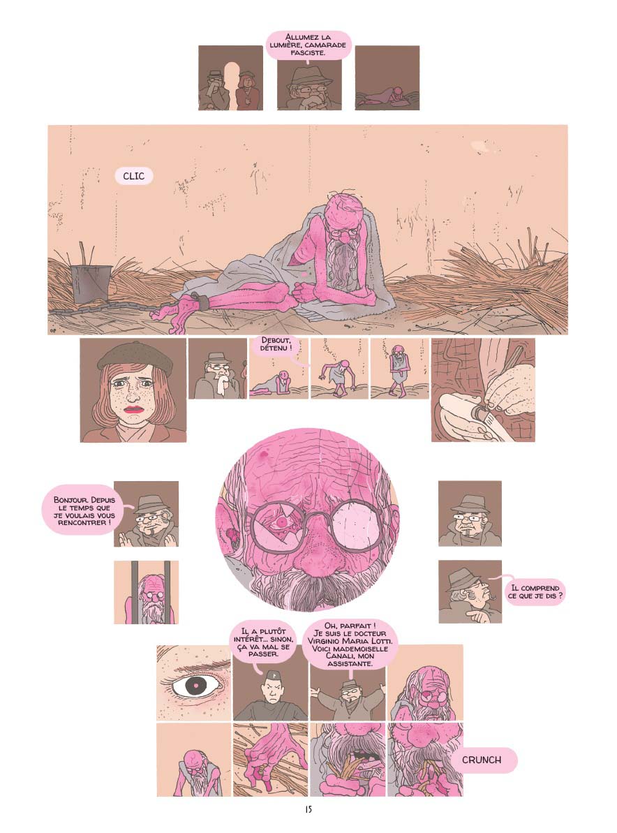 Si en résumé La Forteresse volante est une œuvre à haute teneur politique, elle met aussi en scène des personnages très bien campés psychologiquement. Dans le contexte pesant de la dictature mussolinienne, les rivalités vont s’exacerber et la résistance à un pouvoir arbitraire va s’organiser. Et la qualité principale du récit, c’est bien la nuance dont faire preuve Palloni, lequel, en faisant de ces deux frangins des rivaux, évite le piège de la binarité, d’un côté les gentils communistes, de l’autre les méchants fascistes. Et même s’il y a bien plus de salauds chez les seconds, le personnage d’Attilia a lui aussi ses états d’âme, très bien soulignés par le dessin de Miguel Vila. Celui-ci possède un trait particulièrement pénétrant pour traduire la psychologie des personnages, assorti à une mise en page émiettée, à la fois déstructurée et très graphique, une approche unique dont il a fait sa marque de fabrique avec ses deux premiers albums, Padovaland et Fleur de lait. Les tonalités à dominante rose impriment quant à elle une ambiance irréelle à l’histoire, presque claustrophobique.