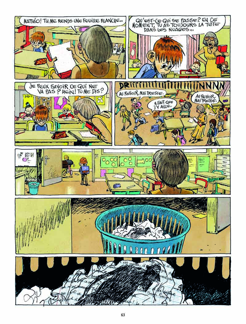 Le récit démarre avec cette ombre noire et inquiétante, qui plane tel un gigantesque croquemitaine sur une barre d’immeuble HLM aux dimensions démesurées, puis embraye vers un registre beaucoup plus rassurant. Dans un avenant pavillon familial, Mattéo est réveillé par sa mère, c’est l’heure d’aller à l’école ! Le garçonnet émerge à peine d’un cauchemar saturé de visions terrifiantes du fameux homme en noir. Mais heureusement le quotidien familier reprend vite ses droits avec l’irruption du chiot Tommy, turbulent compagnon de Mattéo, qui vient le couvrir de léchouilles bien baveuses. Pour un peu, on se croirait dans Boule et Bill, allusion évidente à l’insouciance du jeune âge… Mattéo ressemblerait presque à tous les garçons de son âge, si ce n’est pour son côté hyperactif, ces mictions récurrentes durant son sommeil ou ces sautes d’humeur lorsque par exemple son copain Ivan lui parle de l’homme en noir. Peu à peu, les obsessions du gamin vont s’imposer au fil de l’histoire, notamment cette peur du noir incontrôlable quand vient l’heure de dormir. Et de plus en plus, il montrera un visage accablé par la tristesse et l’angoisse. Jusqu’au dénouement final, où jaillira la terrible vérité, que le déni dans lequel s’est barricadé Mattéo ne suffira plus à contenir. C’est alors que le sol se dérobera brutalement sous ses pieds…