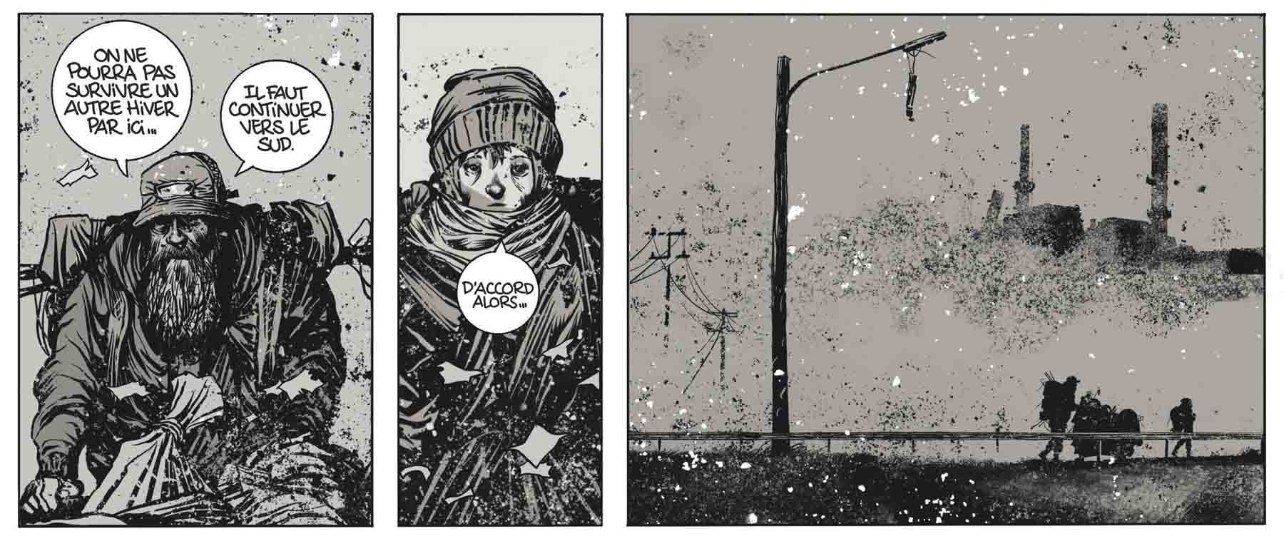Larcenet étant resté très fidèle au roman, l’effet de surprise est donc moindre pour ceux qui l’ont déjà lu et/ou ont eu l’occasion de voir le film de John Hillcoat avec Viggo Mortensen dans le rôle principal. Mais l’auteur du Combat ordinaire ne s’est pas contenté d’être fidèle, il s’est parfaitement approprié le livre, ce que suffit à confirmer la puissance de son trait. Le chemin de croix de ce père et de son fils errant dans un univers de grisaille, pris en tenaille entre le froid et la terreur, poussant sur des routes défoncées un caddie rempli de rares provisions et de leurs maigres biens (quelle image forte !), a été mis en scène avec brio par celui qui fait figure de maître du neuvième art en France.