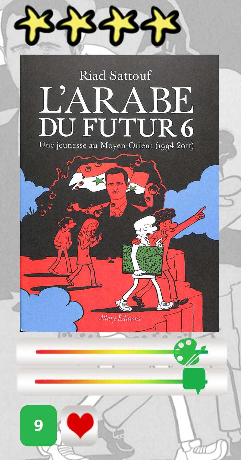 Avec le rêve de Fadi, le tome 6 vient clôturer la saga avec justesse. Une conclusion terrible — dont on ne révélera évidemment rien — et qui pourtant synthétise parfaitement ce que fut véritablement ce père. Même après son retour en Syrie, il resta, non sans une certaine perversité, omniprésent dans la psyché familiale et continua à faire peser son aura toxique sur les états d’âme de Riad, mais heureusement pour nous lecteurs, ne le dissuadera pas de renoncer – même s’il aura eu ses périodes de doute — à son ambition de devenir un grand dessinateur. Et pour toutes les raisons énoncées dans ma chronique globale sur cette histoire incroyable, L’Arabe du futur marquera d’une pierre blanche le neuvième art du XXIe siècle, au même titre que Maus au siècle précédent.