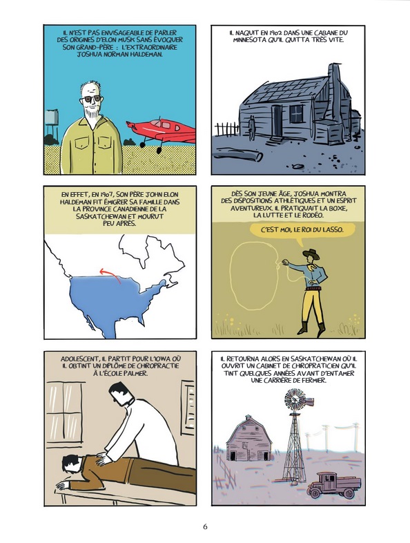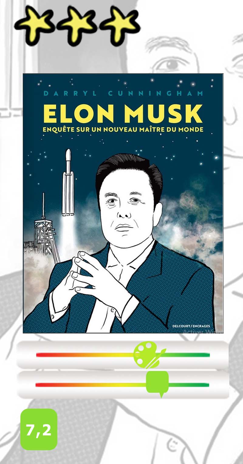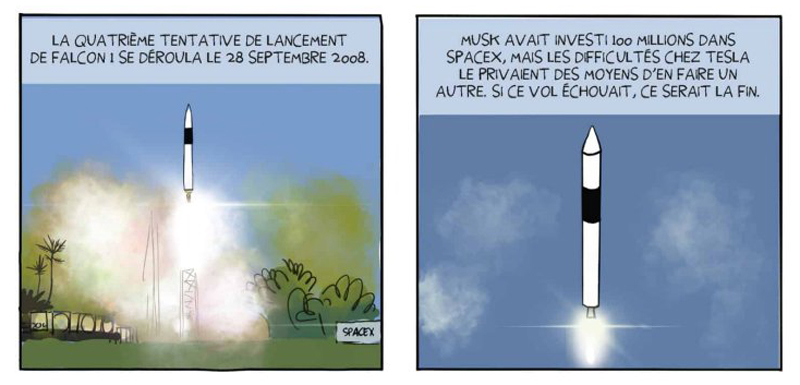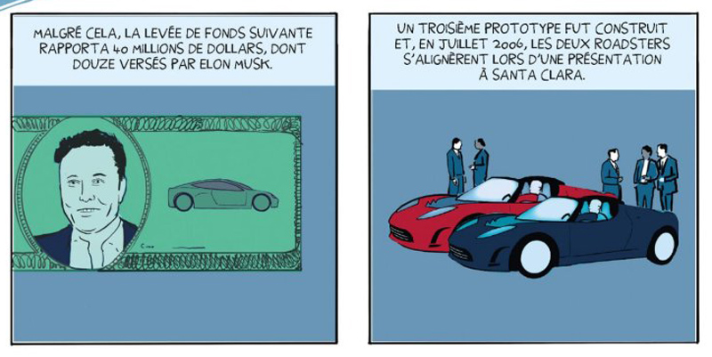 La lecture d’Elon Musk – Enquête sur un nouveau maître du monde semble donc essentielle pour mieux faire connaissance avec cet homme qui passe aux yeux de beaucoup pour un visionnaire audacieux et conquérant. En cela, l’ouvrage de Darryl Cunningham est à la hauteur de nos attentes. Extrêmement bien documenté, il décortique de façon factuelle l’enfance et le parcours de celui qui se situe à mi-chemin entre l’inventeur fou et l’homme d’affaires cynique, accusé de fraudes boursières à maintes reprises. Tout son succès semble s’être construit sur des coups d’éclat pour des projets extrêmement aventureux dont beaucoup ont échoué ou n’ont abouti que partiellement, en deçà des promesses faites. Mais les fanfaronnades de cet as de la com lui auront suffi pour bâtir sa fortune, selon un parcours où les déboires ont pourtant été nombreux. Si l’on excepte Tesla et SpaceX, qui ont atteint un certain niveau de pérennité, on pourra citer les exemples de l’Hyperloop (qui depuis a été remisé dans les cartons) ou de The Boring Company, un réseau de transport souterrain au sein des villes dont un seul a vu le jour à Las Vegas. On daignera volontiers oublier les crashs à répétition des fusées Falcon, mais pour ce qui est de Tesla en revanche, la voiture autonome promise il y a dix ans semble accuser quelque retard…