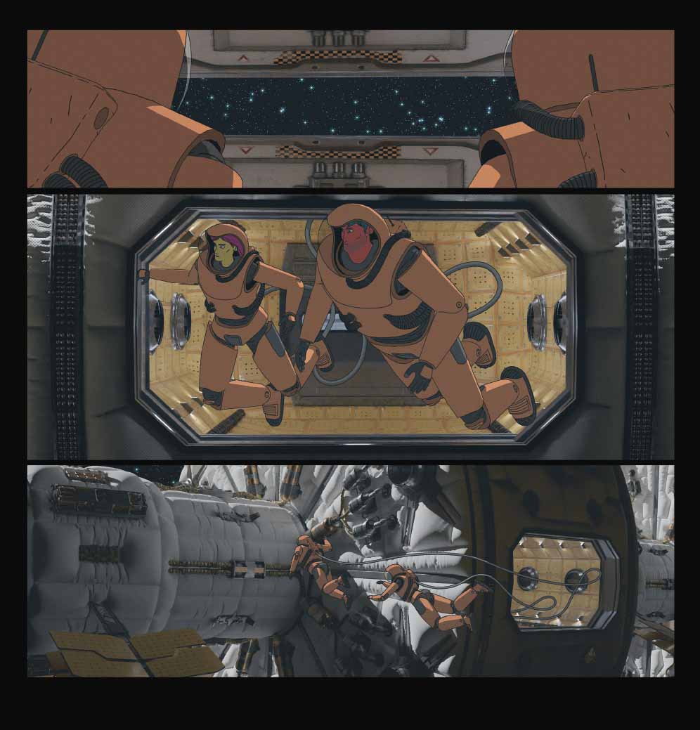 Graphiquement parlant, Philippe Valette a fait une sorte de mix entre dessin et numérique. Son trait aux accents manga s’attache aux personnages, tandis que le vaisseau ou les décors ont été conçus par ordinateur. Le rendu est assez bluffant, sans les défauts propres à cette technique dont certains abusent parfois. Les vues du vaisseau géant ont un aspect très réaliste, mais Valette n’en fait pas non plus des tonnes pour épater la galerie, le recours au procédé restant plutôt discret. Ledit procédé a été utilisé également pour représenter la planète Geminae, dont on ne fait d’ailleurs que distinguer les reliefs à travers l’obscurité omniprésente, renforçant l’ambiance hautement anxiogène du récit.