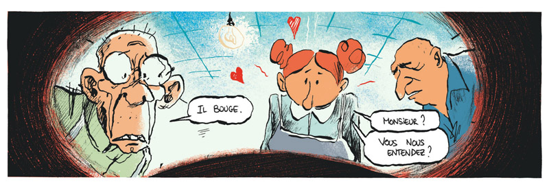 Et puis le dessin, bien sûr… j’ai déjà eu longuement l’occasion de dire tout le bien que je pensais du travail graphique de Pierre-Henry Gomont. Notamment ce sens du détail pertinent pour imprimer une ambiance, allié à un minimalisme astucieux quand il s’agit de souligner les états d’âme des personnages ou un comique de situation, avec toujours ce trait agile et élégant…