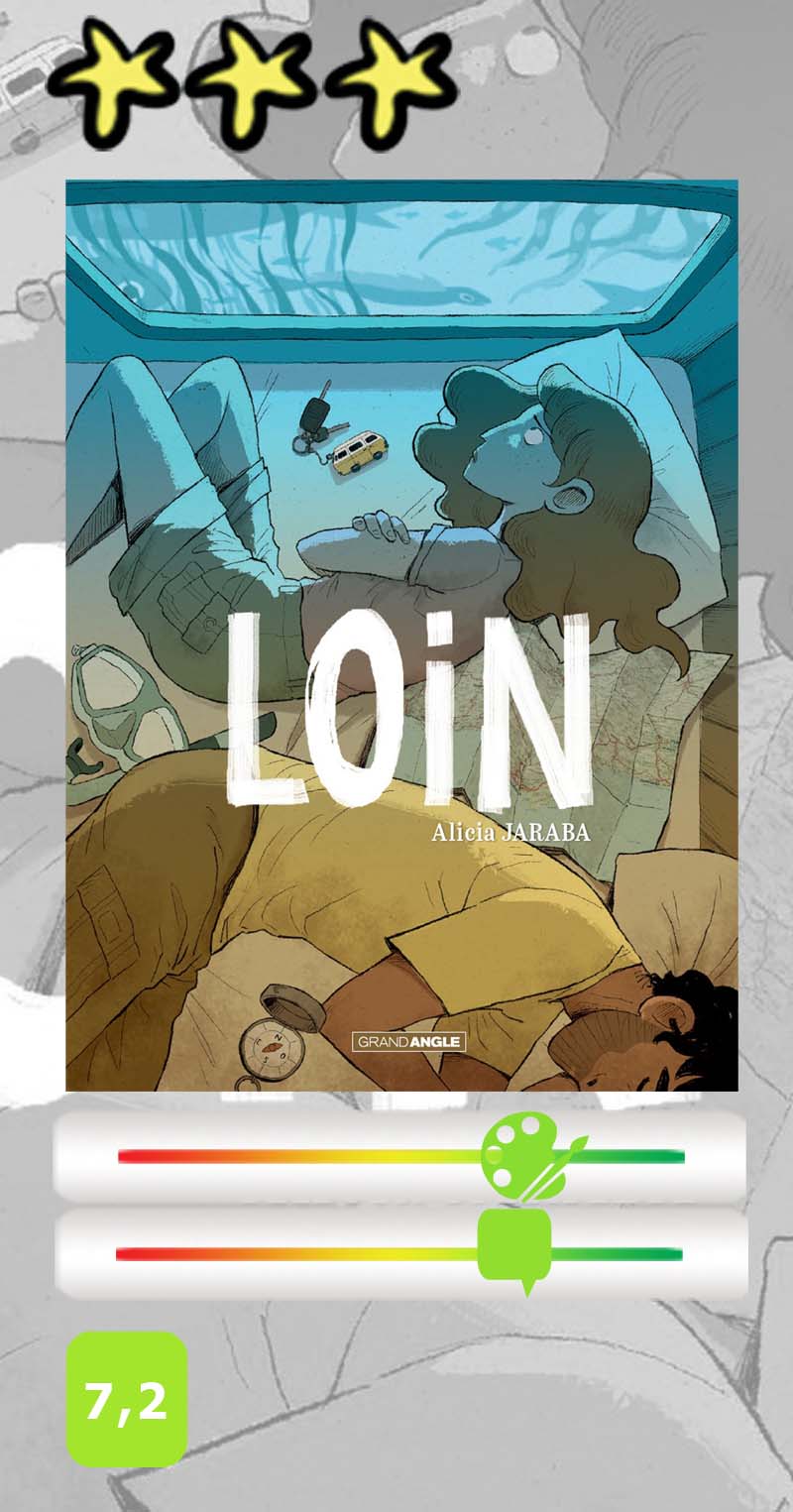 Loin d’être désagréable (et sans mauvais jeu de mot), Loin constitue par excellence la lecture d’été idéale, mais est aussi une BD « feel-good » qu’on peut lire à tout moment, comme on se plaît souvent à le répéter dans une époque toujours plus anxiogène. Une senteur d’iode et de sable fin infuse le récit de façon câline, avec à la clé des questionnements sur un sujet sociétal pas anodin : qu’est-ce que le couple aujourd’hui et le schéma traditionnel « collé-serré » est-il encore viable aujourd’hui ? Alicia Jaraba, jeune autrice espagnole talentueuse, a choisi l’angle de la légèreté pour aborder la question, et elle a eu bien raison !