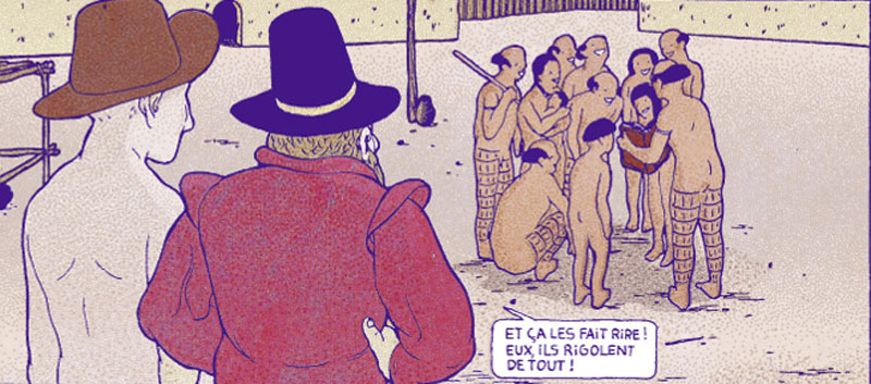 En évoquant la brève présence des Français dans le Brésil du XVe siècle, bientôt chassés par les Portugais, ce récit donne à David B. l’occasion de déplacer la perspective historique en relativisant la « sauvagerie » de ces Indiens du Brésil, car si ceux-ci consommaient de la chair humaine (estimant par ailleurs que ceux qui la mangeaient crue étaient des sauvages !), ils étaient un peuple paisible à la physionomie avenante, vivant en harmonie avec les éléments, loin de l’image d’Épinal du barbare primitif. Et comme on le verra, leurs « proies » promises au festin semblaient accepter leur sort avec philosophie. La sauvagerie n’était-elle pas plutôt le fait des colonisateurs, qui n’hésitaient pas à massacrer ces peuples quand ils ne voulaient pas collaborer ? Cela étant, David B. ne fait pas non plus dans le mythe rousseauiste du bon sauvage. Dans ce livre, on découvre que les Tupinambas, dès lors qu’ils étaient menacés, n’hésitaient pas à se défendre de la façon la plus sanglante, peu importe que l’attaquant soit l’Homme blanc ou une tribu adverse. Recourant à un humour subtil, l’auteur en profite pour tacler la religion des conquérants, adeptes des conversions forcées, face à des Indiens qui eux, « ne cherchent à convertir personne », confortant la décision de Nicolas à vivre parmi eux.