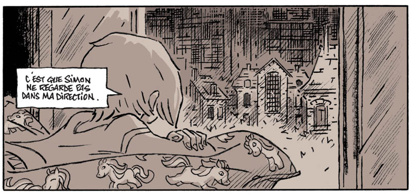 Très bien construite et assez captivante, la narration de Simon & Lucie va évoluer en se centrant principalement sur le personnage de Simon, qui n’hésitera pas à s’abimer pour sauver l’amour qu’il croyait être réciproque avec Lucie. En effet, ce garçon possède un cœur pur, un rien fleur bleue. Et le monde est bien trop étroit pour abriter sa quête d’absolu, vers laquelle il cherche à entraîner son amante, en vain. Au docteur qui lui affirme que ce n’est pas en faisant des allers et retours dans la réalité qu’il s’en sortira, Simon lui rétorque qu’il a accepté l’idée d’être fou. Sa folie, c’est de ne pas lire jusqu’au bout les romans, ou de ne pas s’en souvenir, tout comme il refuse de croire à la fin de son histoire avec Lucie.