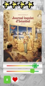 En dehors du fait que Journal inquiet d’Istanbul est formidablement bien raconté, « diablement » bien dessiné, les lecteurs les plus empathiques, désormais familiers de l’univers unique de l’auteur avec ce deuxième tome, pourraient avoir l’impression que ce dernier est devenu en quelque sorte un ami. Oui, Ersin Karabulut est un auteur attachant, de la famille des humanistes, une famille mondiale pour qui un compatriote peut parfois paraître plus étranger qu’une personne vivant à l’autre bout de la Terre. En Turquie, il fait partie de ceux qui jettent « un pont entre l’Orient et l’Occident », comme le serait pour les Français un certain Riad Sattouf. On attend la suite avec une sincère impatience.