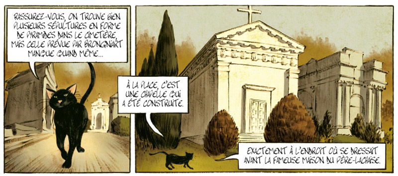 Pour chaque chapitre du livre, dont la narration est chapeautée par Sébastien Floc’h, c’est un maître de cérémonie habitué des lieux, un chat noir bien vivant celui-là, qui de son pas feutré va dénicher pour nous les secrets derrière ces tombes silencieuses, apportant à l’ensemble une jolie note poétique. Et comme à tout seigneur, tout honneur, c’est à celui qui a donné son nom au site que sera dédié le premier chapitre, François d’Aix de La Chaize, ayant vécu au XVIIe siècle. On y apprend que celui-ci, simple jésuite s’étant enrichi grâce à sa position privilégiée aux côtés de Louis XIV, avait fait construire à l’emplacement même du cimetière actuel (dénommé à l’époque le Mont-Louis) une demeure luxueuse entourée de jardins à la française. Cent ans après sa mort, le site fut transformé en la nécropole que l’on connaît aujourd’hui.