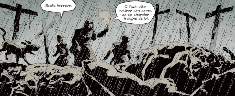 Avec un graphisme tout à fait conforme aux codes du genre, l’élégance et la finesse du trait en plus, l’auteur nous offre une mise en page très variée et souvent spectaculaire, avec une belle utilisation du noir et blanc pour les clair-obscur. Abbadon, le gardien des enfers est représenté comme un ninja, et Satan ressemble à s’y méprendre à Nosferatu. Les démons apparaissent tels des trolls polymorphes tout droit sortis du Seigneur des anneaux, dans un décor évoquant peu ou prou la Moria. Bien sûr, les échanges demeurent plus biblico-philosophiques que physiques, mais la lecture n’en est que plus fascinante, Robin n’a pas non plus cherché à la jouer blockbuster en mode bourrin, loin de là.