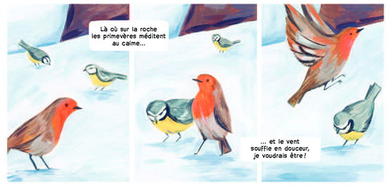 C’est une jolie promenade picturale que nous offre Mayte Alvarado sur ces Terres bleues, en hommage à cette artiste s’inscrivant dans le mouvement expressionniste d’outre-Rhin. Dans une imitation totalement assumée de l’art de Gabriele Münter, Alvarado produit un récit plein de douceur, tout en simplicité et avec peu de mots, les images parlant pour elles-mêmes. Comme le suggère le titre, c’est le bleu qui domine au milieu d’une palette de couleurs très variées, ce bleu alpin qui enveloppe les montagnes et met le spectateur en immersion totale avec la nature omniprésente, qui sert de toile de fond à des scènes de la vie quotidienne, des pique-niques, des promenades à vélo ou en barque. Autant de cases qui apparaissent comme des tableaux, et selon les termes de l’autrice en préface, des tableaux qui sont « comme des fenêtres ».